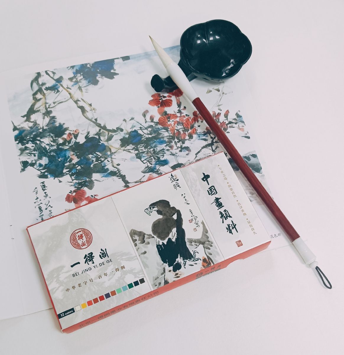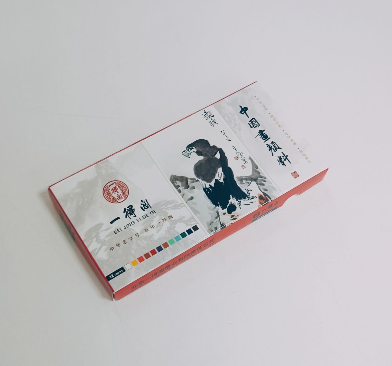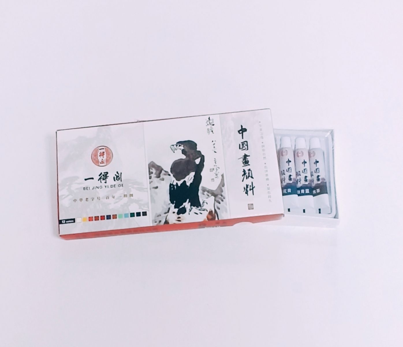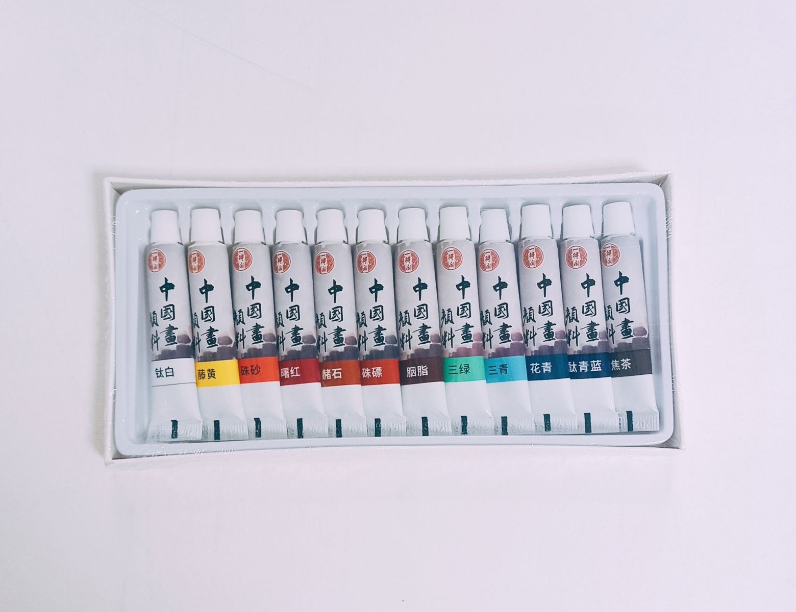В наборе 12 наиболее популярных цветов в китайской живописи: белый, жёлтый (гуммигут), розовая киноварь, оранжевая киноварь, кармин, охра, "третий зелёный", "третий синий", цианин, фталеин, "сухой чай".
