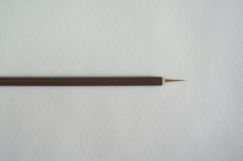 Длина ручки 17,5 см, длина кисти 1,2 см, диаметр у основания кисти 0,2 см. Состав: заячья шерсть. Ручка выполнена из стебля. Ручная работа. Миниатюрная кисть с острым кончиком. Незаменима для прорисовки мелких деталей. Также используется для нанесения контуров в работах в стиле гунби и каллиграфических работах в стиле сяокай (мелкое письмо почерком кайшу) и шоуцзинь (почерк "тонкого золота").