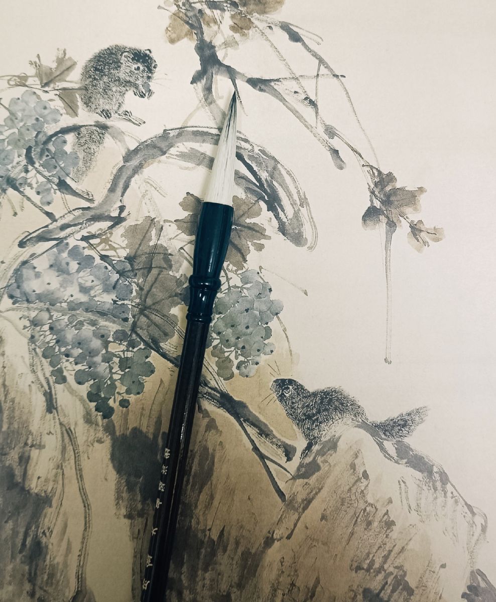 Мягкая козья шерсть отлично набирает и удерживает воду, краски и тушь, а упругая шерсть кролика собирается в тонкий кончик и позволяет проводить изящные линии. Используется для картин в стиле сеи в любых жанрах, а также для каллиграфических работ в стиле кайшу.