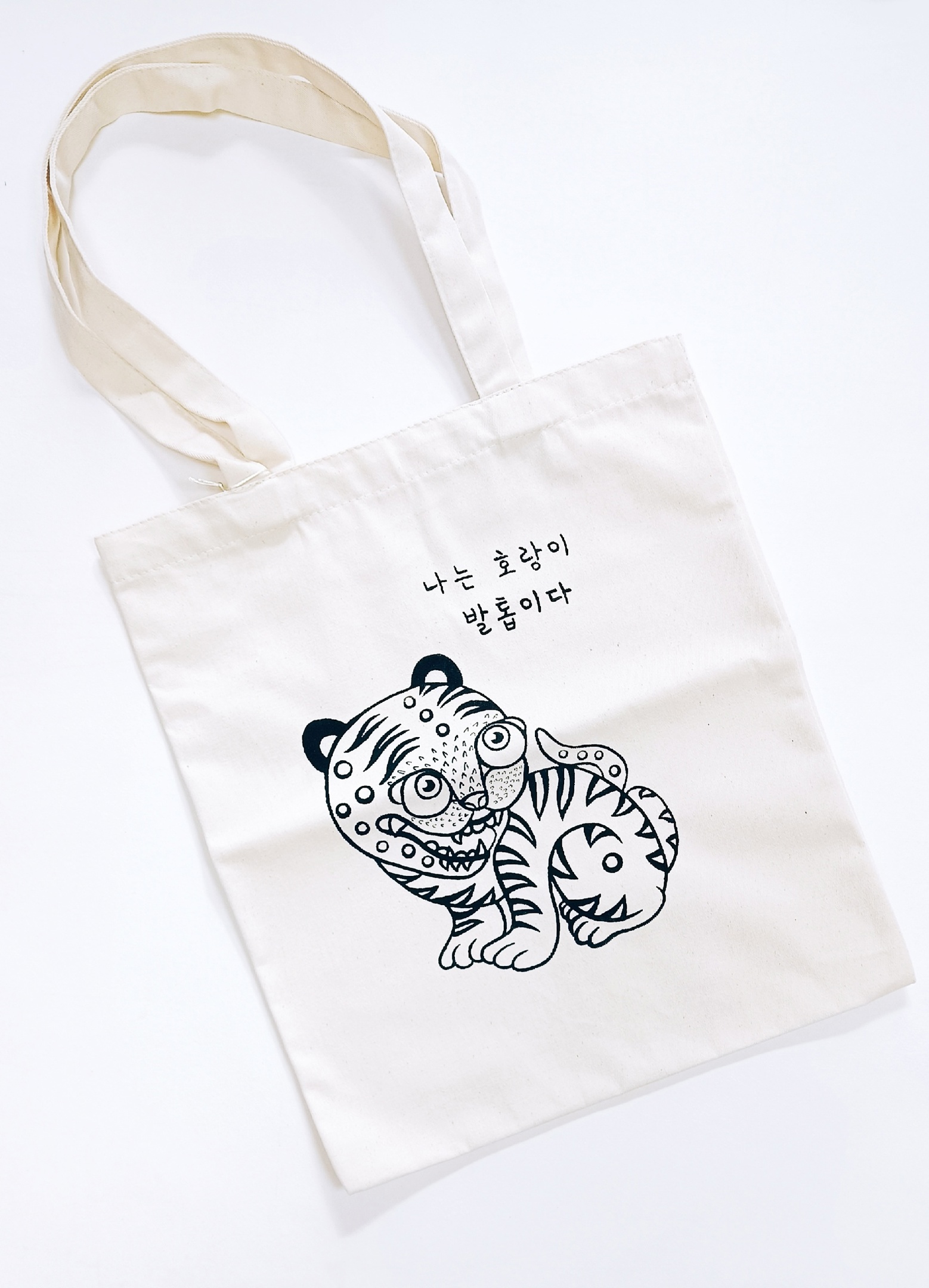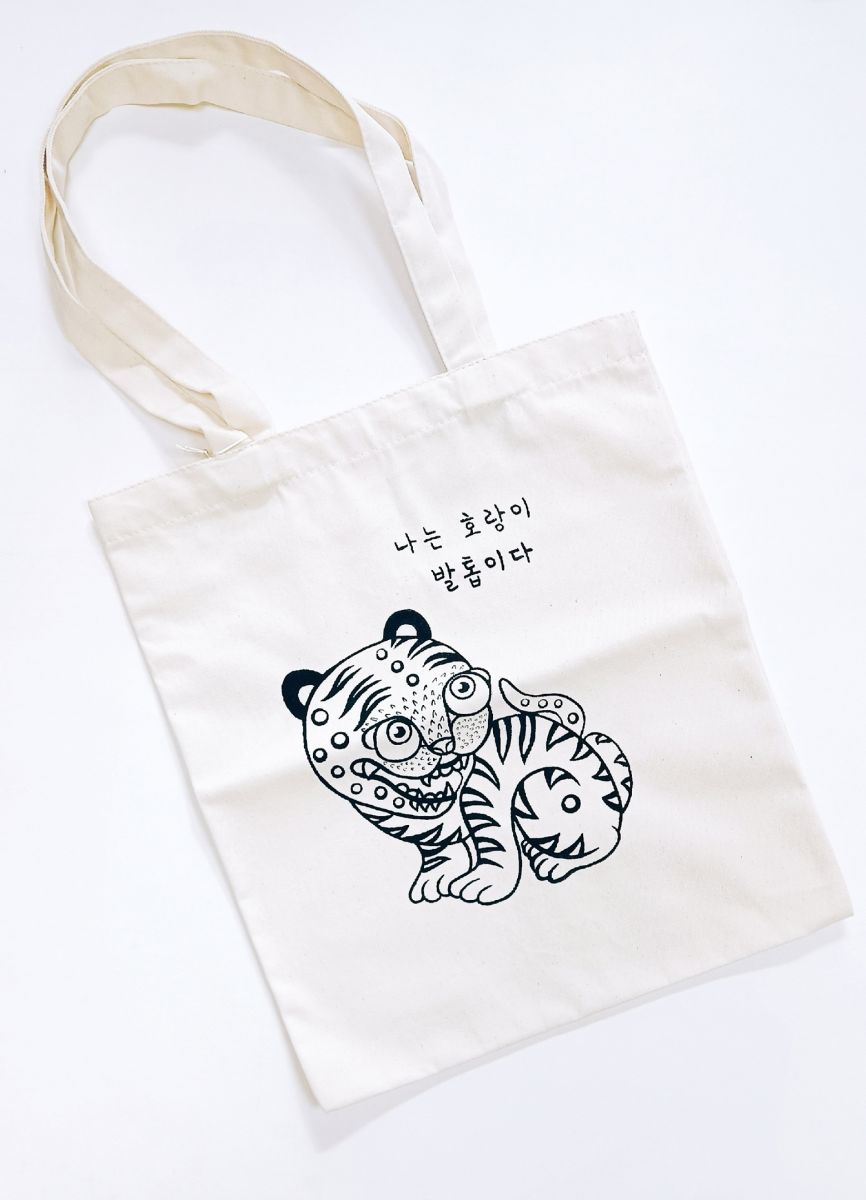 Сумка с авторским дизайном художницы и преподавательницы корейской живописи Екатерины Егоровой. Размер 35*40 см. На сумке надпись 나는 호랑이 발톱이다 (У меня тигриные когти).